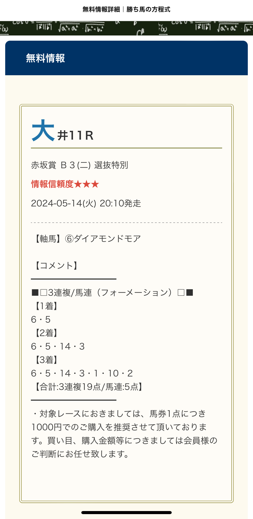 平日の無料予想でこれだけ高配当は本当に感謝しかありません。