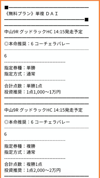 無料予想買い目点数1点で単複ダブル的中