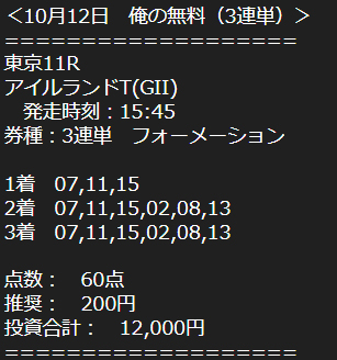 馬券代総額9900円で6万8970円獲得